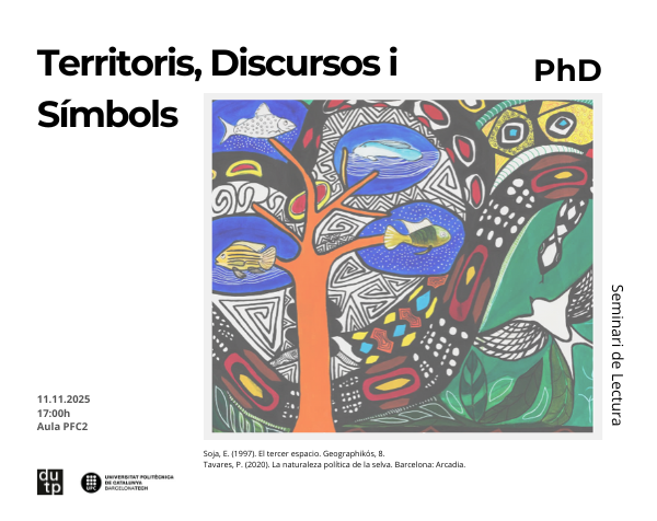 Territoris, Discursos i Símbols 11.11.25 https://utp.upc.edu/ca/noticies/territoris-discursos-i-simbols https://utp.upc.edu/ca/noticies/territoris-discursos-i-simbols/@@download/image/PUBLICACIÓ - NOTÍCIA WEB (12).png Comparteix: Territoris, Discursos i Símbols 06/11/2025 11.11.25 Seminari de Lectura PhD"Territoris, Discursos i Símbols" Oberta al públic Dimarts 11 de Novembre, ETSABAula PFC2 - 17:00h